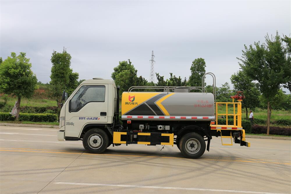 灑水車前裝有鴨形噴嘴或圓頭沖嘴,后面裝有圓柱開灑水噴嘴或蓮蓬頭噴嘴,后部有一工作平臺(tái),裝配有水炮。后部還可裝8個(gè)噴嘴(選裝)。