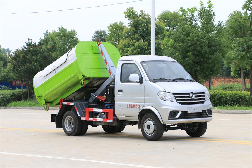 該款鉤臂式垃圾車由液壓系統、操作系統組成。舉升油制缸(1支)系國內知名液壓件廠家生產的雙作用油缸。垃圾廂可自吊上放下,可自行傾倒垃圾,上下一次工作循環時間≤50S。該車的特點是一個車能配多個垃圾廂,能實現一臺車與多個垃圾廂聯合作業,循環運輸,充分提高了車輛的運輸能力。