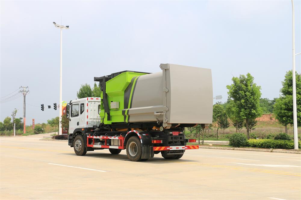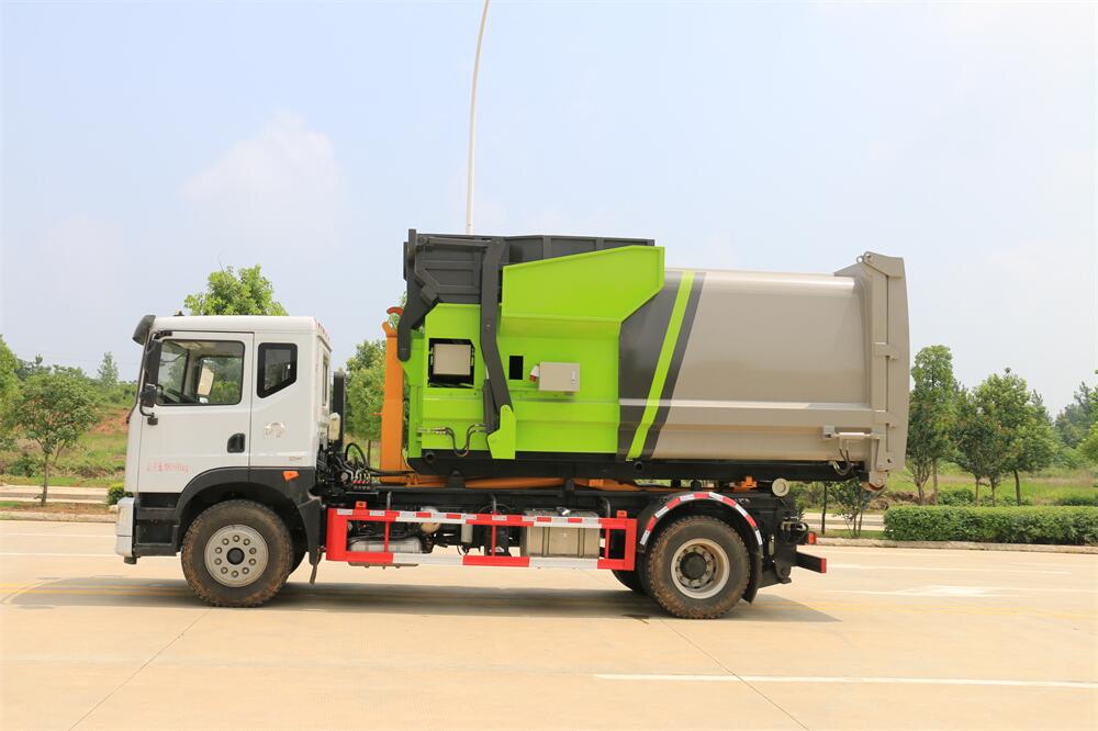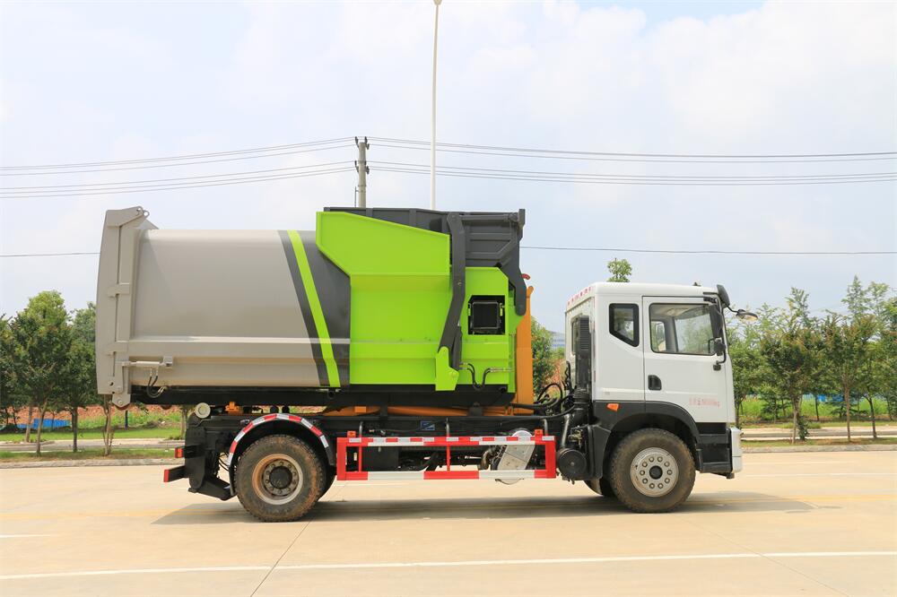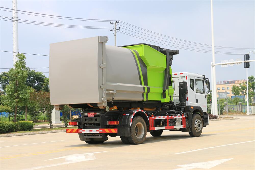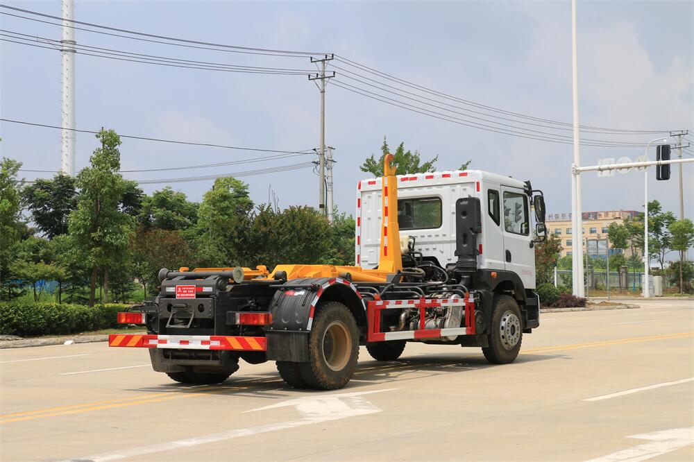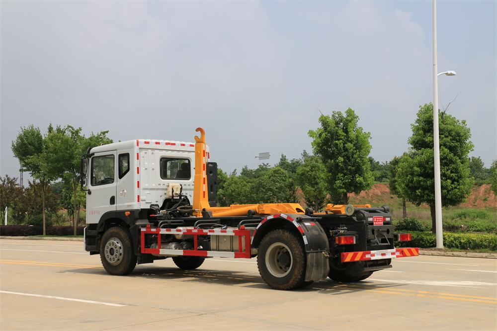 勾臂式垃圾車(車廂可卸式垃圾車)介紹: 車廂可卸式垃圾車又叫拉臂式垃圾車,是一種采用高新設(shè)計(jì)可伸縮的鉤臂,實(shí)現(xiàn)垃圾廂的二次吊裝,自吊上放下,可自行傾倒垃圾的環(huán)衛(wèi)設(shè)備。 拉臂式垃圾車結(jié)構(gòu)簡單,操作穩(wěn)定方便,裝卸效率高,機(jī)械化程度高,節(jié)省人力。鉤臂垃圾車一車可帶多個(gè)垃圾廂,在裝卸的運(yùn)輸過程中可有效地避免二次污染。 拉臂垃圾車采用高新設(shè)計(jì)可擺動(dòng)的鉤臂,垃圾箱由框架、開啟油缸、滑輪、后門和若干加強(qiáng)框架與鋼板焊接而成。調(diào)換貨廂快捷方便,貨廂上帶蓋(倒垃圾時(shí)可翻開),鉤臂垃圾車?yán)鴰w可選用碳鋼、不銹鋼材質(zhì)、內(nèi)部采取環(huán)氧樹脂防腐處理,改裝部分與原車底盤為可分離式,維修方便且保持了原車的機(jī)動(dòng)性及行駛性能。