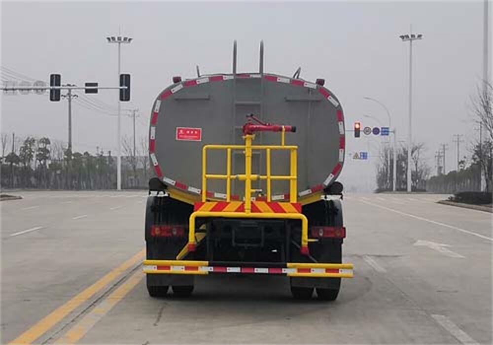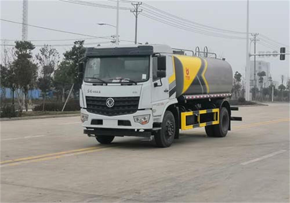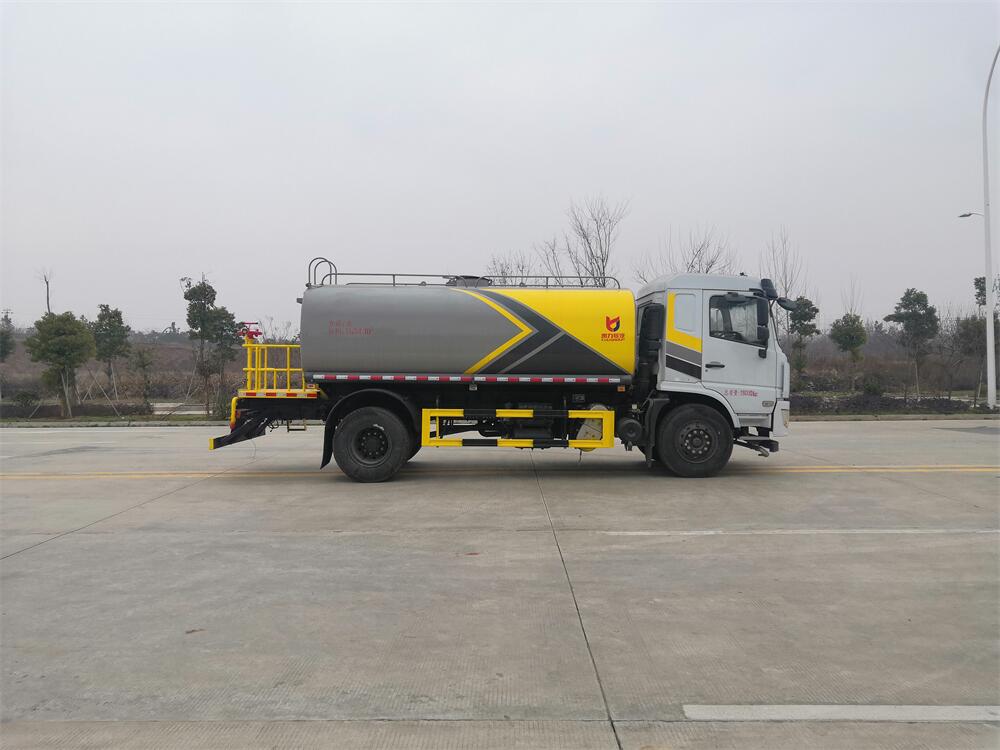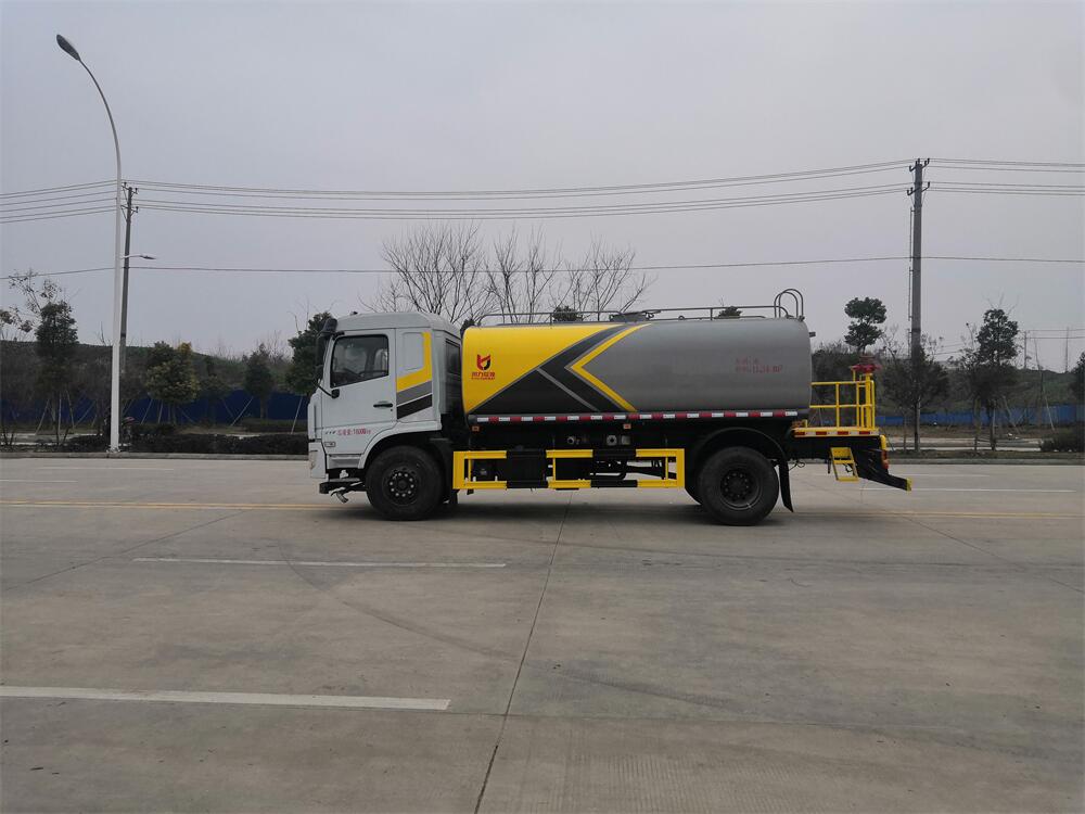 灑水車前裝有鴨形噴嘴或圓頭沖嘴,后面裝有圓柱開(kāi)灑水噴嘴或蓮蓬頭噴嘴,后部有一工作平臺(tái),裝配有水炮。后部還可裝8個(gè)噴嘴(選裝)。