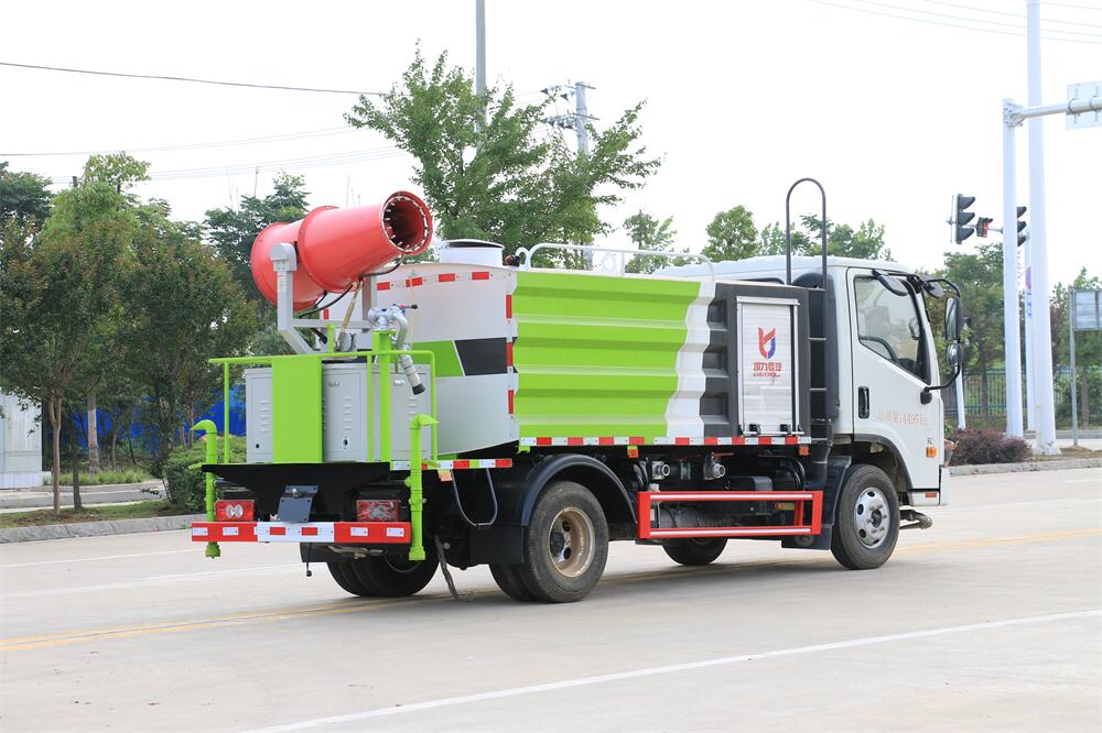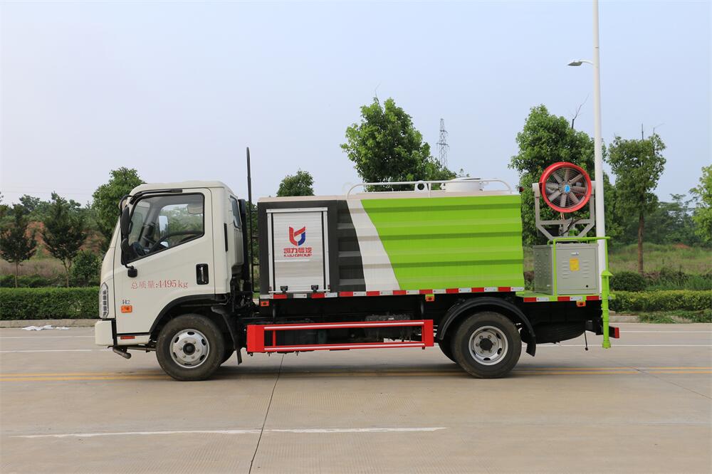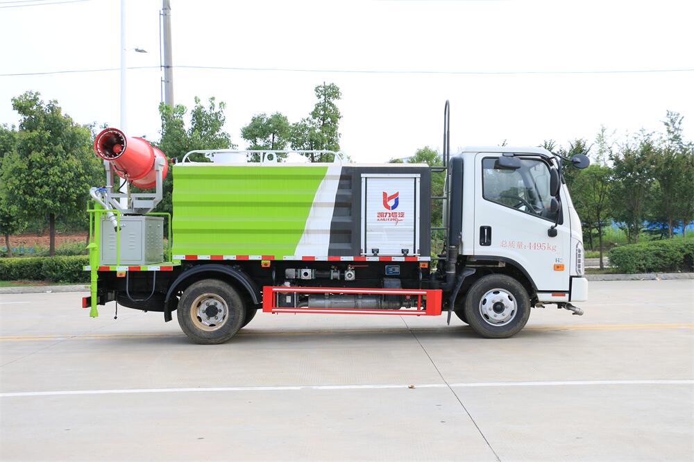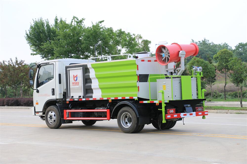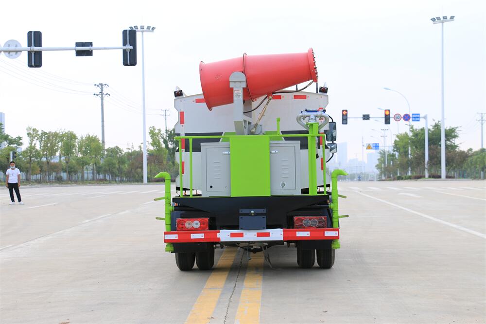 上裝配置:罐體容積為 5立方,選配風送式霧炮機組射程30米、40米、50米、60米、80米、100米、120米霧炮,罐體鋼板為4mm碳鋼Q235材質,罐內隔板具有防波作用,以減輕汽車行駛時罐體液體沖擊,罐體及整車外形尺寸按照公告。帶大功率專用灑水泵,泵可自吸自排,整車前沖、后灑、側噴、帶65消防接口,后平臺配CLW-50、CLW-60、CLW-80、CLW-100、CLW-120型風送式霧炮機組;罐體前封頭配大功率柴油發電機組;前封頭帶水位計,后平臺主管路帶1寸澆花接口,后爬梯。帶兩根輸水管及陰陽端。罐體顏色:銀/灰/綠,罐體兩側噴“多功能抑塵車”字樣,貼反光標示。