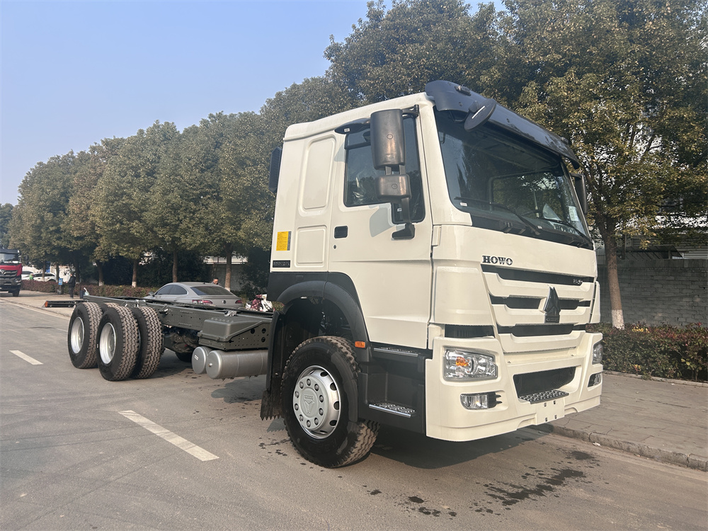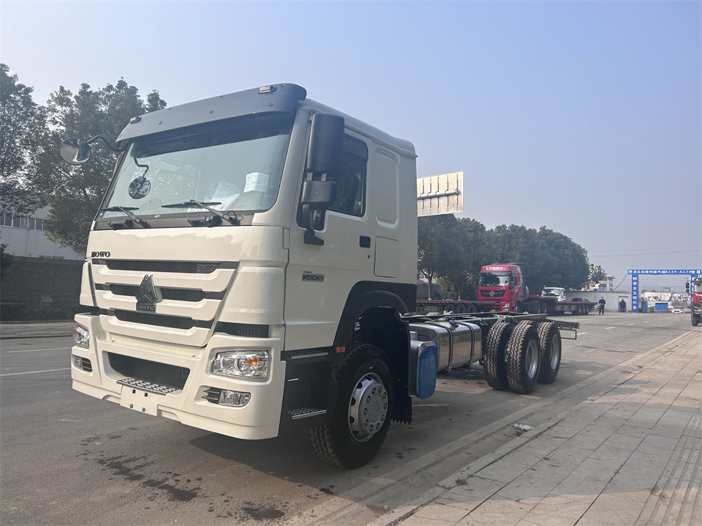 ZZ1257N4647B1R 出口HC16雙后橋(鼓),雙層車架(8+8/300),前后加強版多片簧(10/12),HW19710變速箱+HW70法蘭式取力器,WP10.340E22發(fā)動機,HW76新前臉駕駛室,12.00R20輪胎(混合花紋/18PR),不帶ABS,速比5.73,高位保險杠(全金屬),右置方向機,VGD95前軸(鼓)