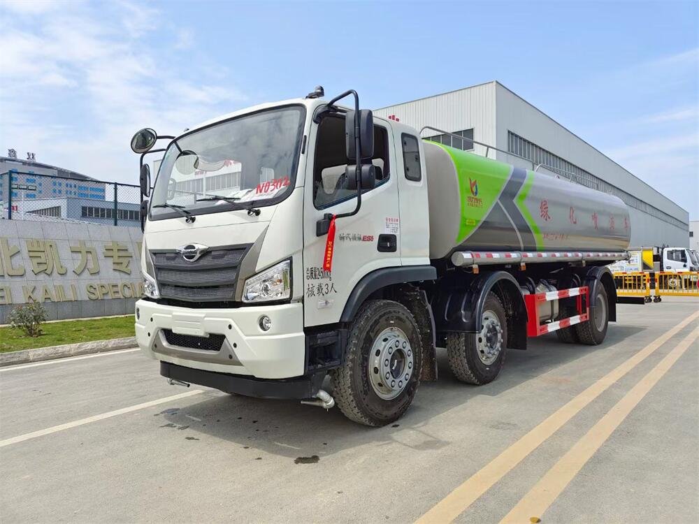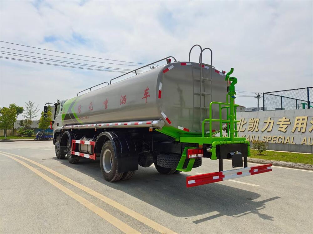 灑水車前裝有鴨形噴嘴或圓頭沖嘴,后面裝有圓柱開灑水噴嘴或蓮蓬頭噴嘴,后部有一工作平臺,裝配有水炮。后部還可裝8個噴嘴(選裝)。